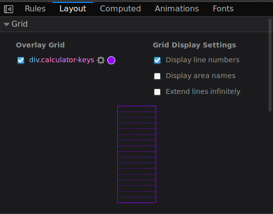 Select the div.calculator-keys grid container we just created. This draws a grid overlay around the grid container to help you visualise the layout. With the overlay activated, any changes to the grid will be easy to see.