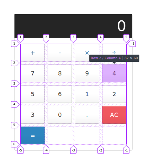 We can define rows and columns for a grid container using the grid-template-rows and grid-template-columns properties. For our calculator layout, we need to place the keys in four columns of equal width.