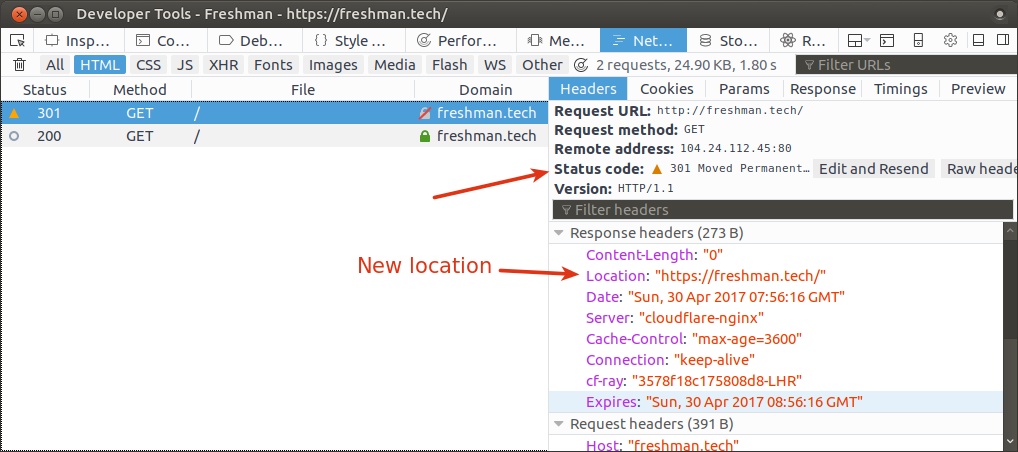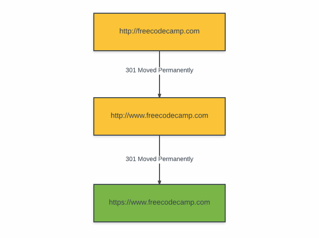 For example, try loading freecodecamp.com in your browser. Notice that it redirects to https://www.freecodecamp.com. This actually happens in two steps:
