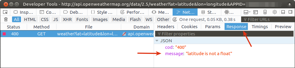 We get a 400 error because we passed invalid values to the lat and lon parameters.