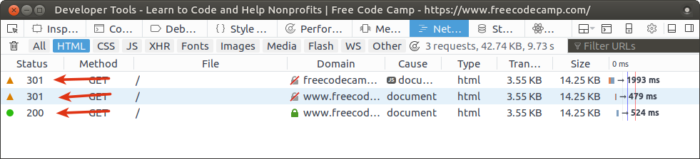 Watch the network requests carefully. Notice that there are two 301 redirects logged. The first one redirects http://freecodecamp.com to http://www.freecodecamp.com which also returns a 301 status code indicating its new location to be https://www.freecodecamp.com. This url finally gives a 200 OK response.