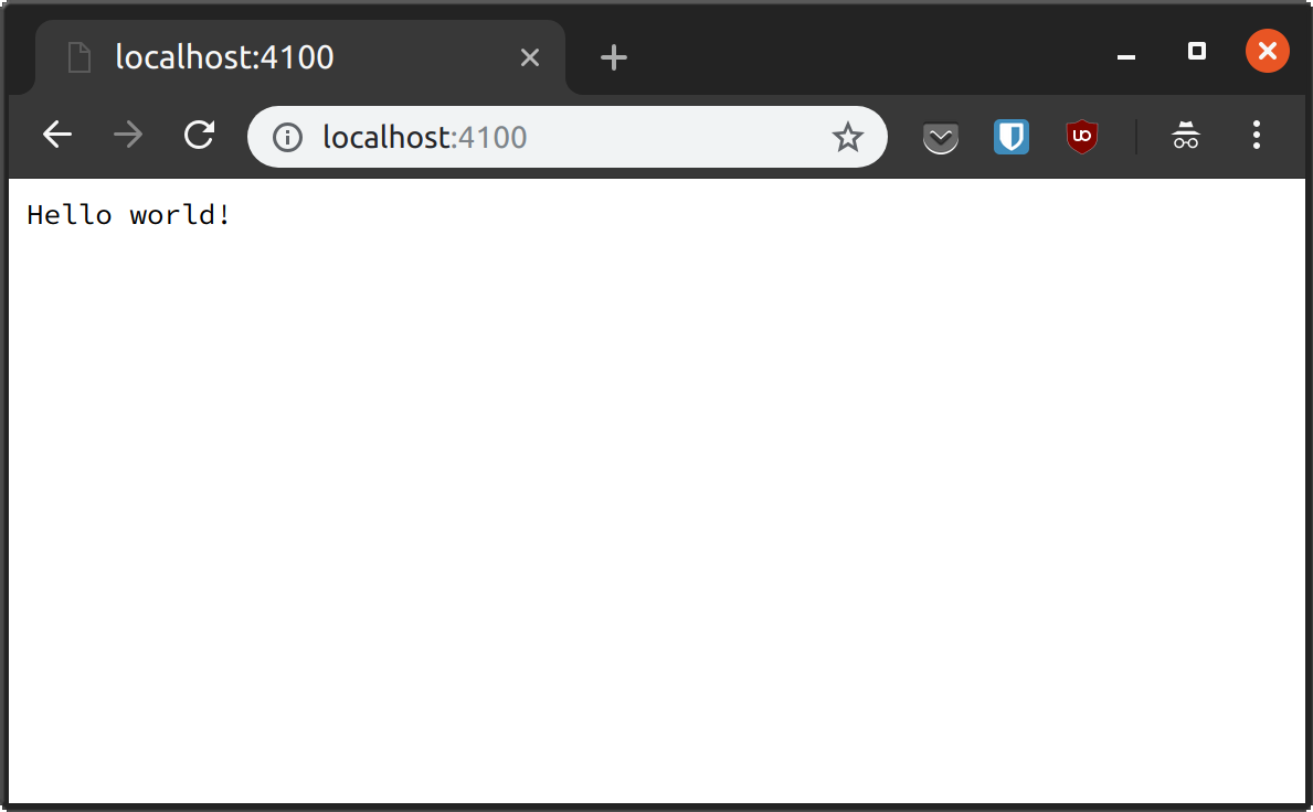 You can start the server by running node index.js in the terminal. Once your server is running, visit http://localhost:4100 in your browser. You should see the words “Hello world!”.