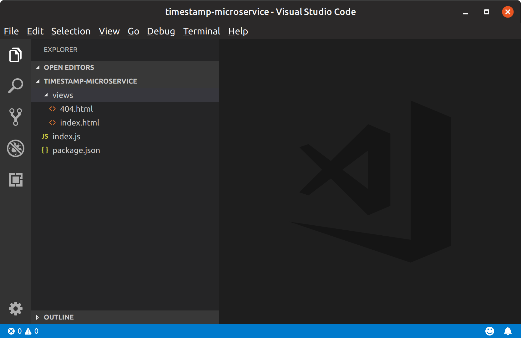 cd timestamp-microserviceThe first step when starting a new Node project is to initialise it with a package.json file. This file contains some information about a project including its name, description, author and all the packages that it depends on. Here’s the command that helps you create a package.json file for your project: