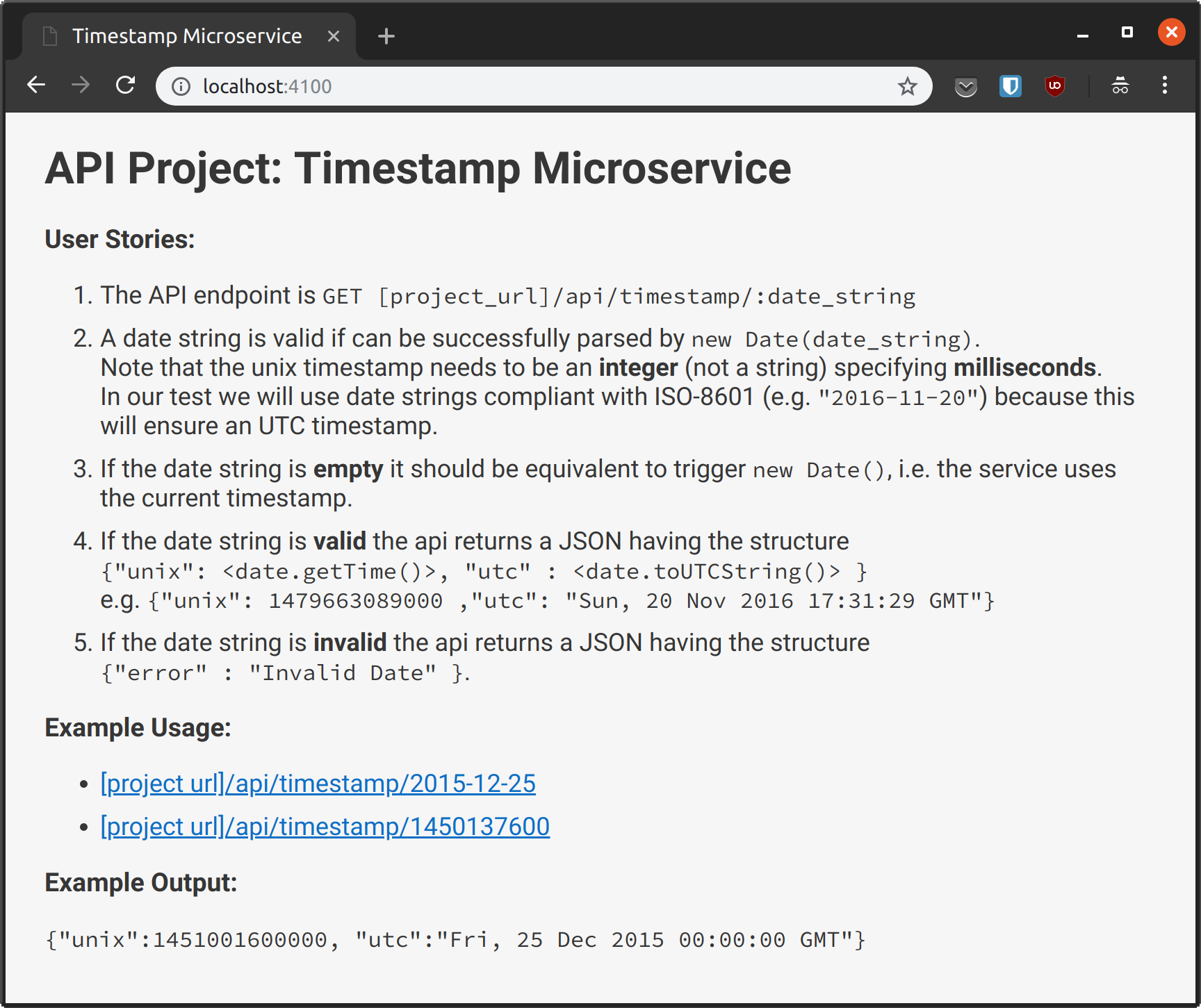 <li>If the date string is <strong>valid</strong> the api returns a JSON having the structure<br><code>{"unix": <date.getTime()>, "utc" : <date.toUTCString()> }</code><br>