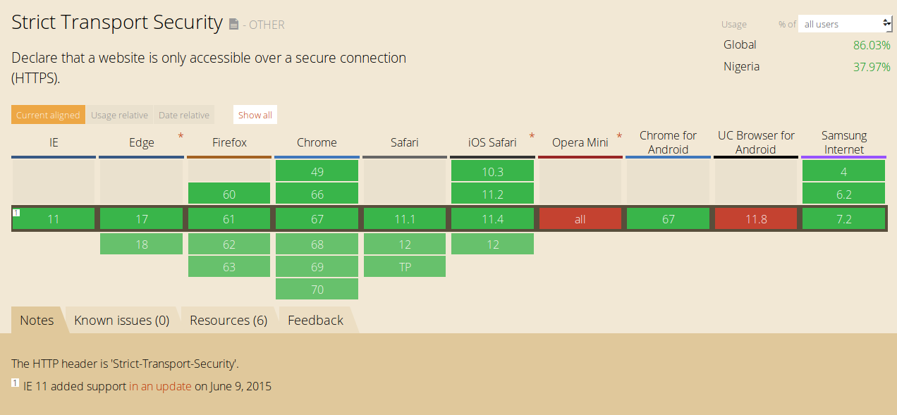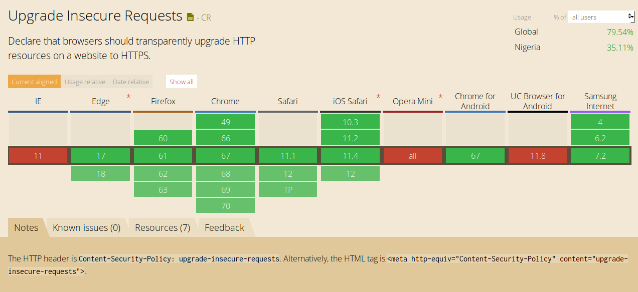 The only downside to this method is that support for upgrade-insecure-requests is non-existent in Microsoft Edge and Internet Explorer. So its best to combine this method with the previous one so as to cover the majority of your users.