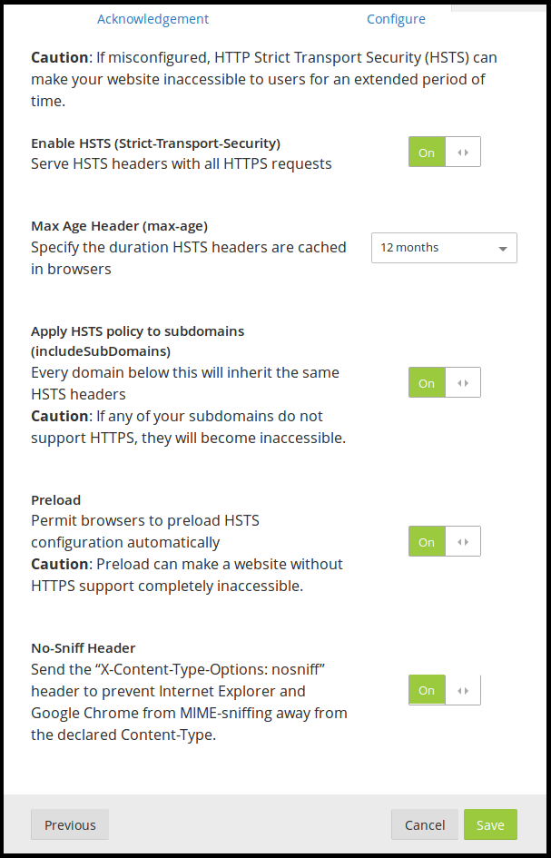 Click Change HSTS Settings, enable all the relevant options and hit Save.