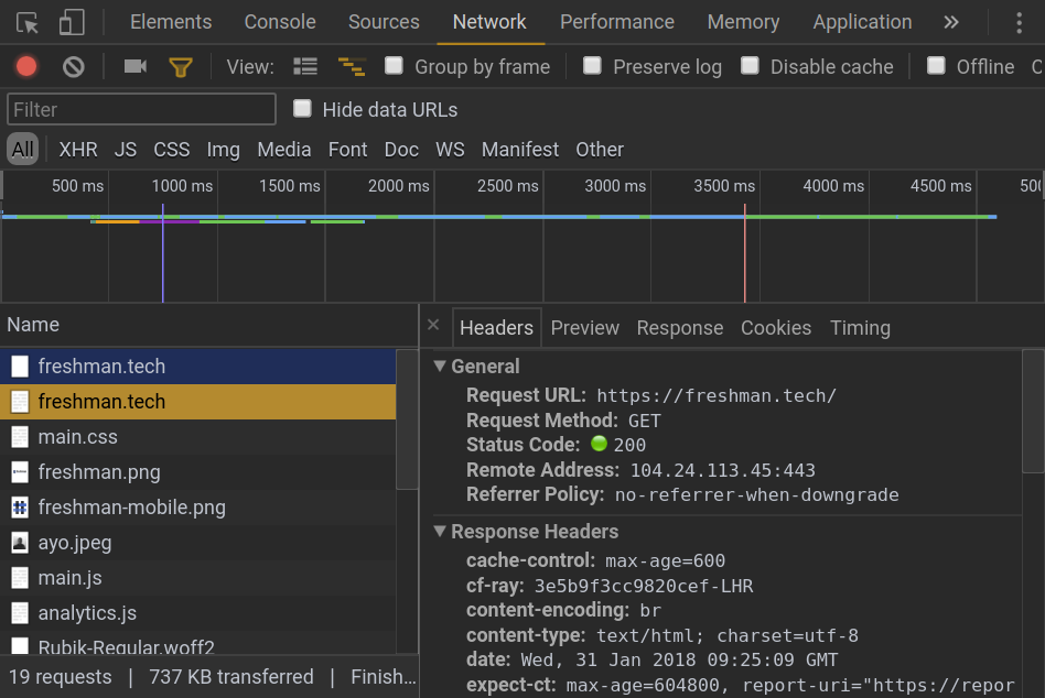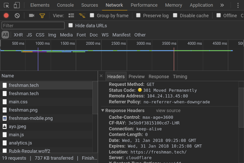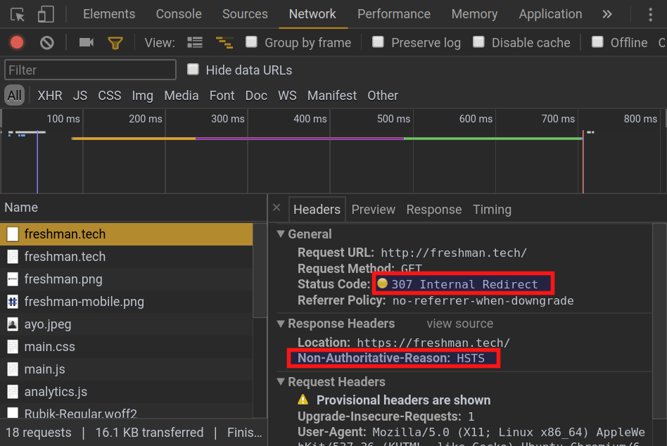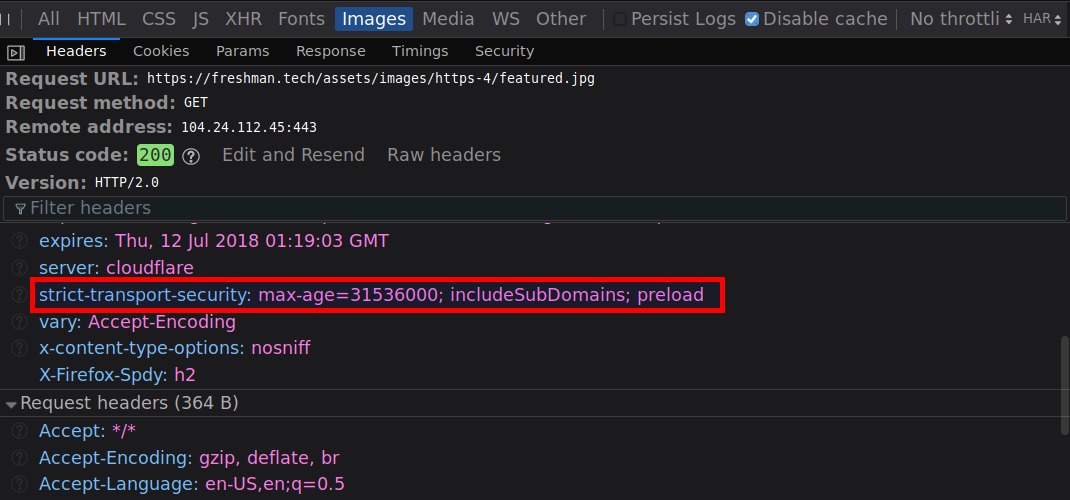 strict-transport-security: max-age=31536000This header specifies to the browser that it may not make an insecure request to the site for the next 31,536,000 seconds (365 days). If the browser, for any reason, attempts an insecure request to the website within this time period, a 307 internal redirect is triggered as the browser first upgrades the request to use the secure HTTPS protocol before sending it over the network.