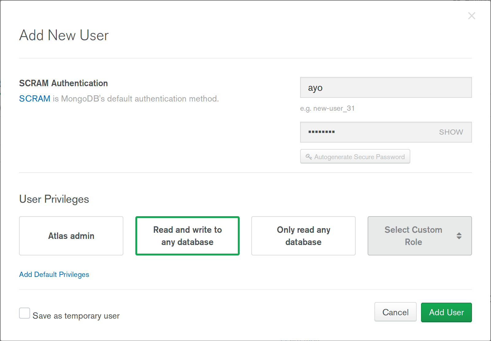 Next, click the Security tab and hit the Add new user button. Give the user a name and password, then click the Add user button.