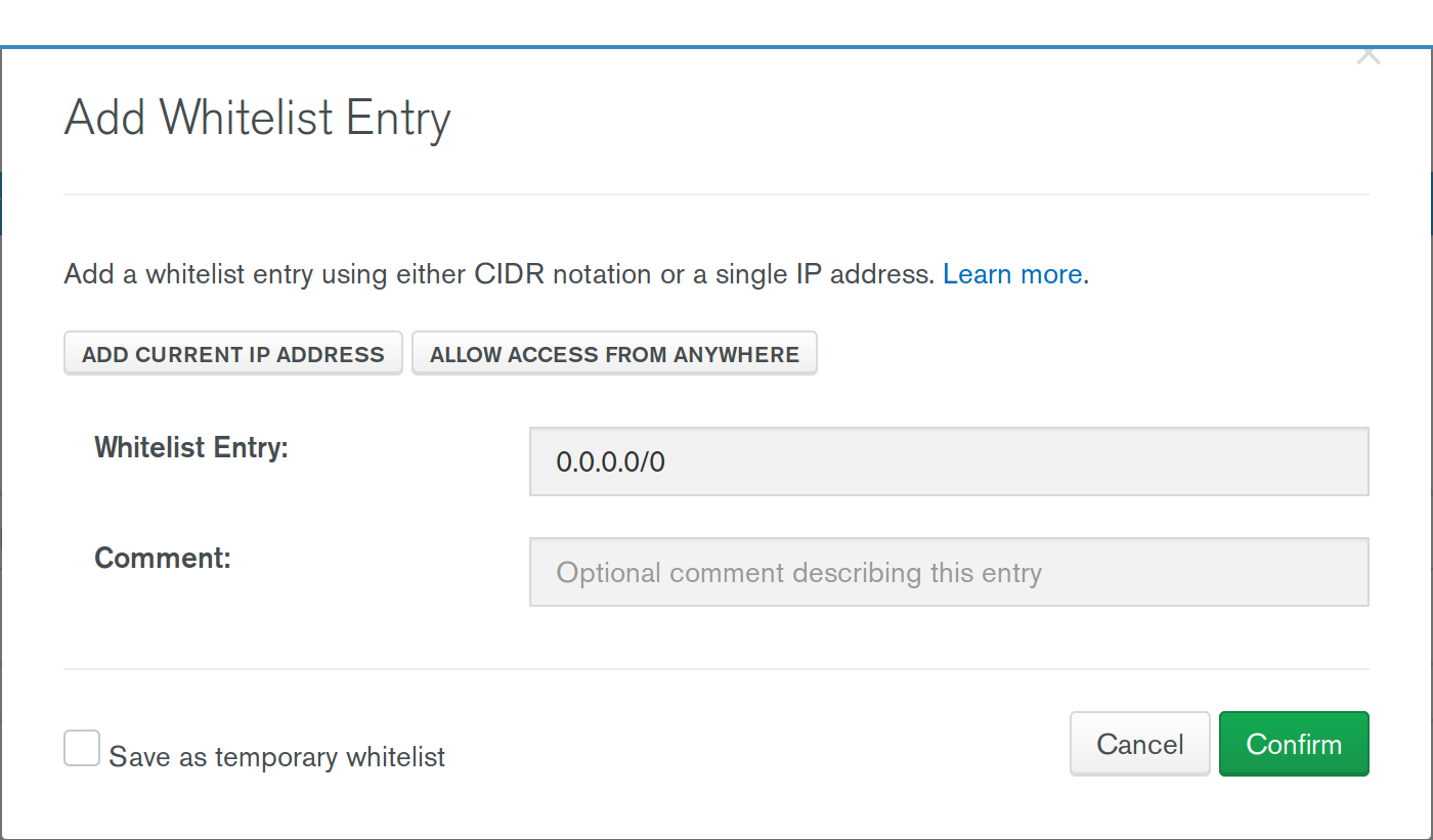 Following that, click IP Whitelist and then Add IP Address. This allows you to choose what IP addresses can access your cluster. Since this is just a demo application, you can allow access from anywhere by clicking the Allow Access From Anywhere button.
