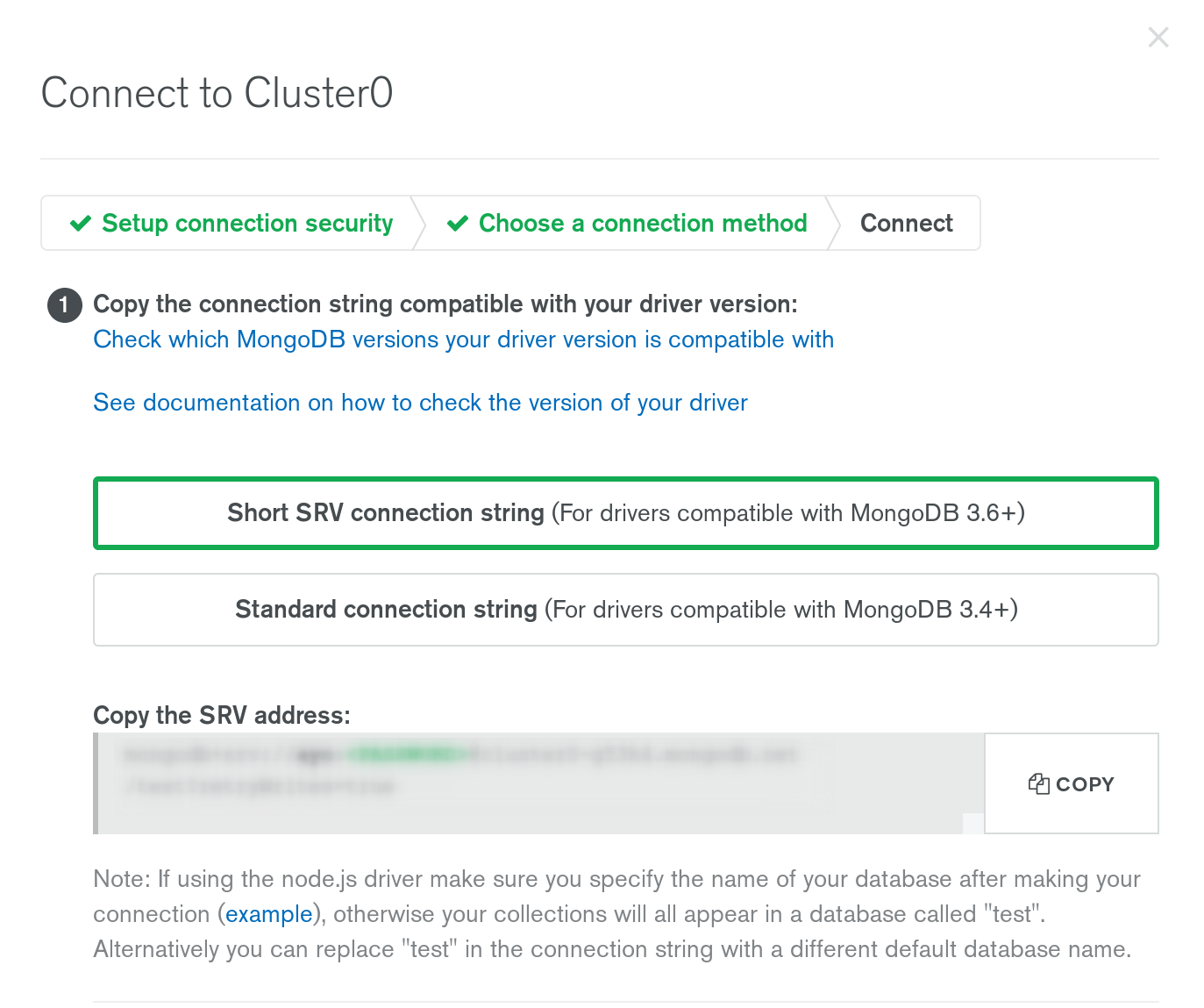 Next, go back to the Overview, and hit the Connect button. Choose Connect your Application and then Short SRV connection string. Take note of that string as we’ll be using it shortly on Heroku.