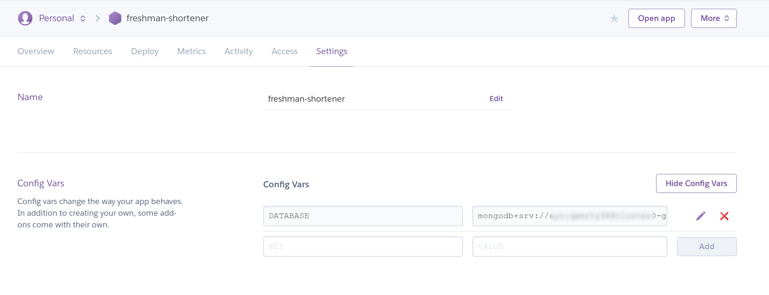 }Before you deploy the app, head over to the Settings tab in the Heroku dashboard and hit Reveal Config Vars. This is where you will set the environmental variables for your app.