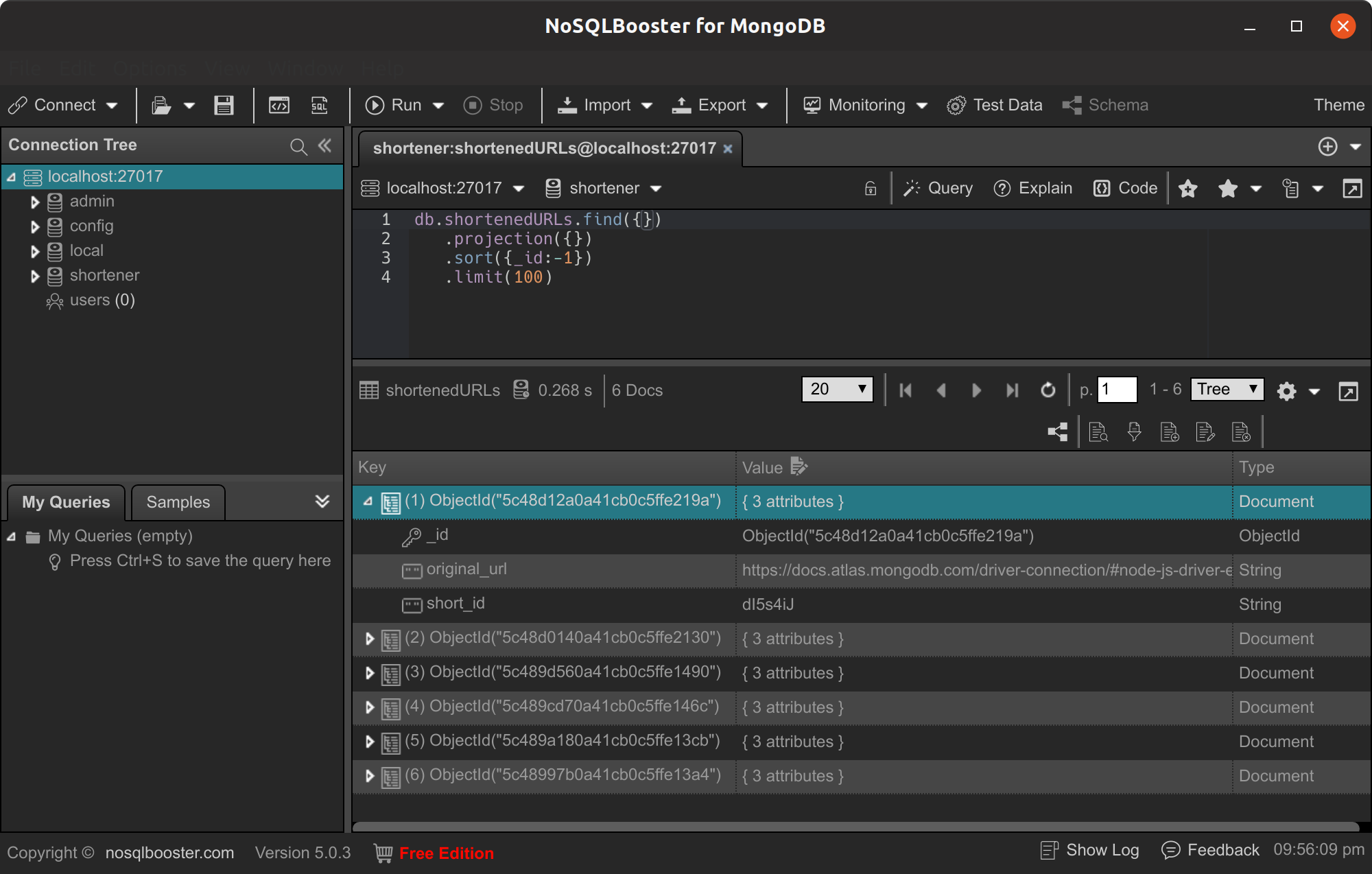 In this case, the document will have two properties: original_url which is the url to be shortened, and short_id which is a unique 7 character id for that url.