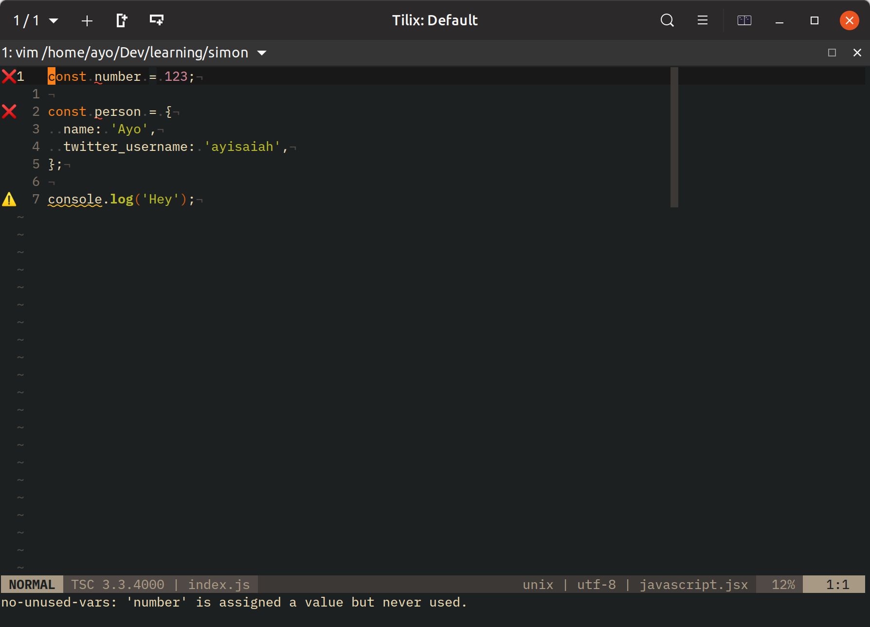 let g:ale_fix_on_save = 1At this point, linting and formatting errors will be annotated by ESLint, while Prettier formats the code on save.
